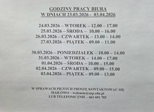 Godziny pracy biura w dniach 23.03.2026 – 03.04.2026